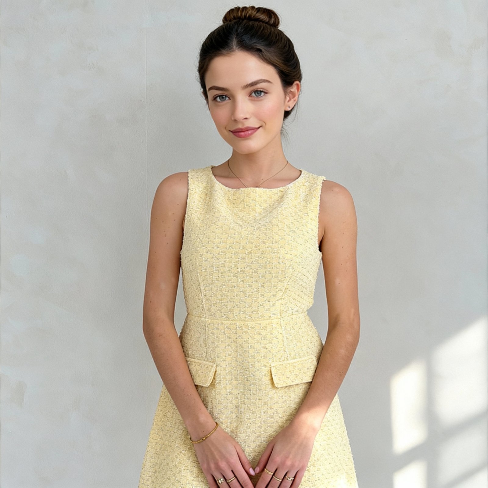 Crafted from premium tweed fabric (customizable composition), the dress boasts an authentic, textured finish that exudes timeless sophistication. The vibrant yellow hue adds a modern, cheerful touch to the traditional tweed aesthetic, making it a versatile piece that appeals to diverse customer preferences.