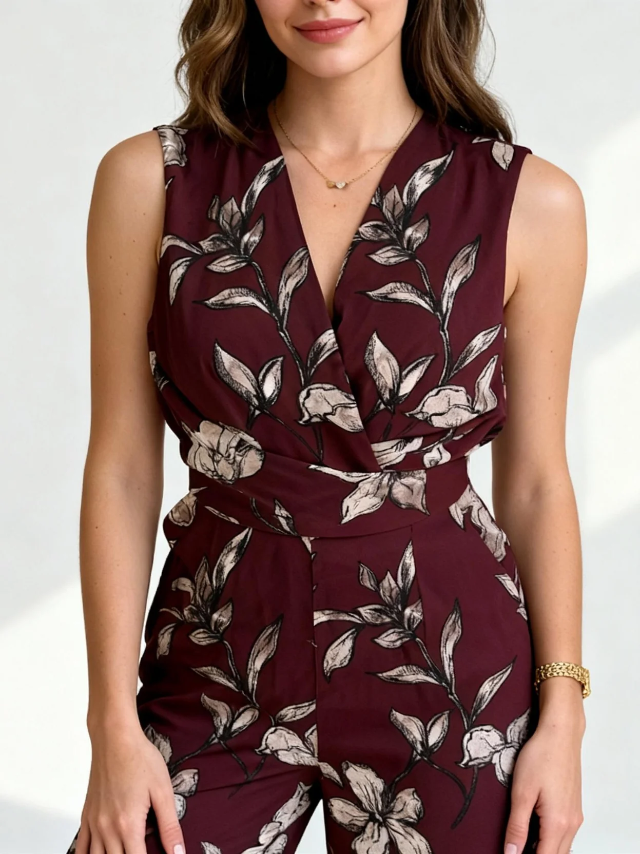 Rich Burgundy Floral Print The carefully designed floral print features rich burgundy tones that complement various skin tones and hair colors. The print is strategically placed to create a balanced silhouette, with larger motifs positioned to flatter the wearer’s figure. This sophisticated color palette makes the jumpsuit suitable for both daytime and evening wear.