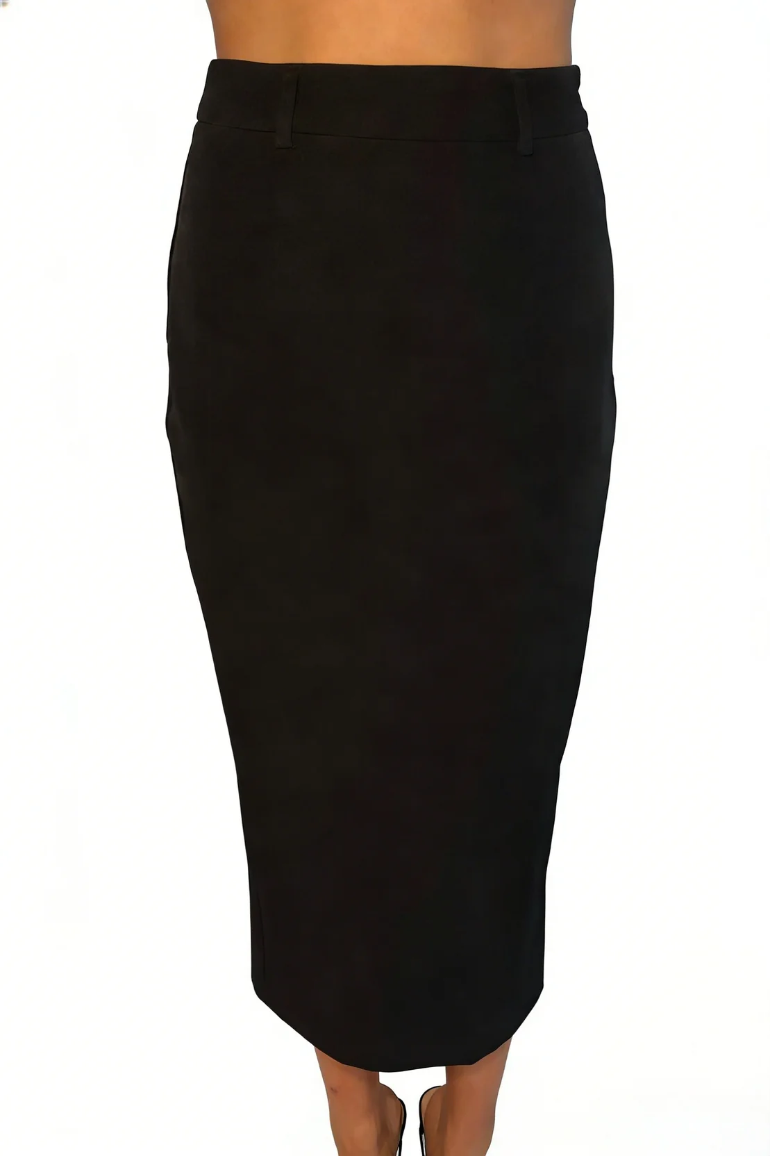 Introducing the ultimate wardrobe versatility piece, this reversible black tailored midi skirt offers two distinct looks in one sophisticated garment. Designed with premium dense stretch fabric that flatters every curve, you can wear it with the front split or the back split to suit your occasion and mood. Mix and match with Bobby or Jamie Waistcoat for complete tailored looks.