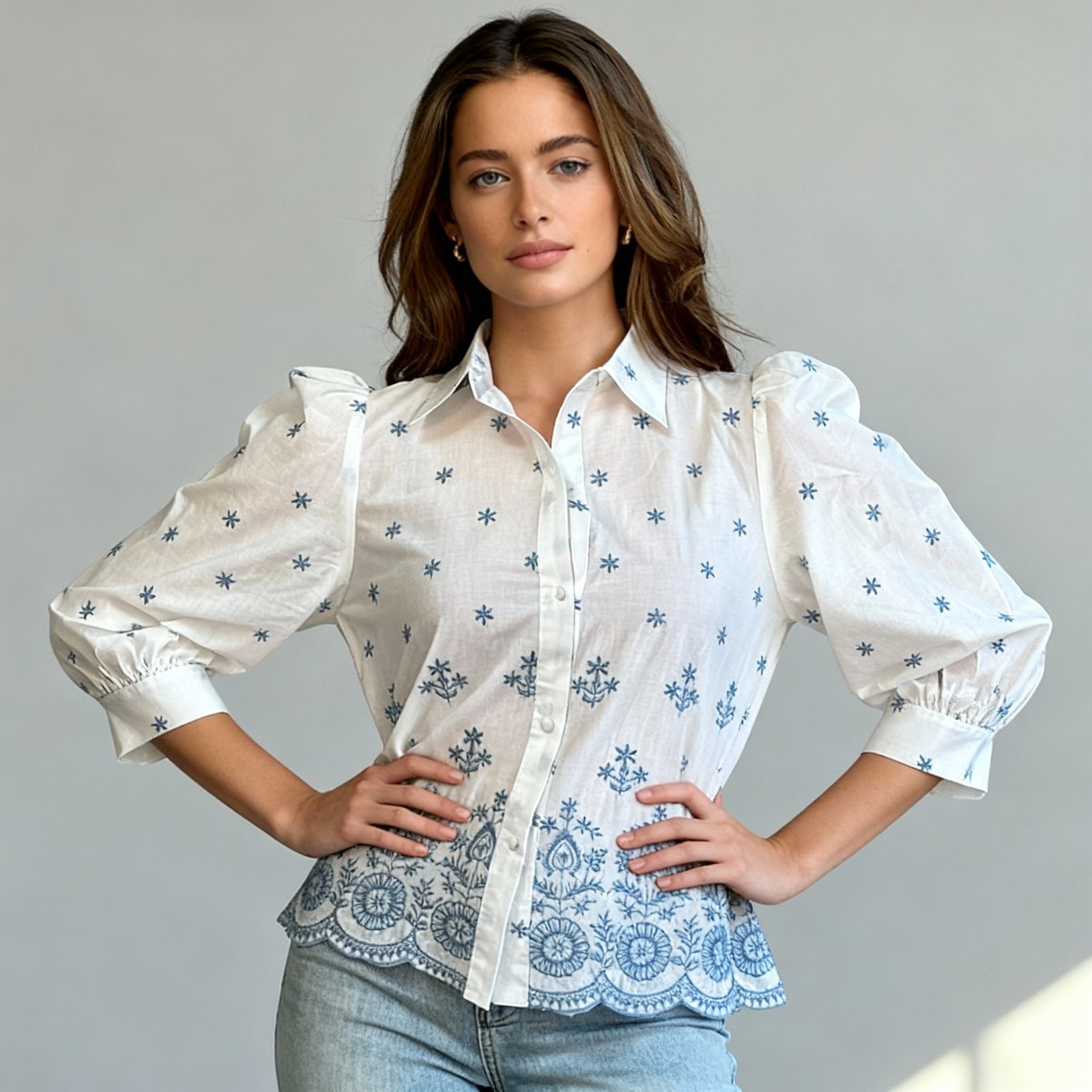 When searching for an embroidery cotton shirt manufacturer that delivers exceptional quality with flexible minimum order quantities, you have discovered the ideal wholesale partner. This exquisite Embroidery Puff Sleeve Cotton Shirt represents the perfect fusion of artisanal craftsmanship and contemporary design, making it an essential piece for fashion-forward retailers and boutique owners seeking premium blouses.